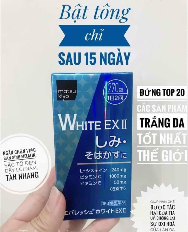 +Với các thành phần được chiết xuất hoàn toàn từ các nguyên liệu thiên nhiên nên viên uống trắng da trị nám White EX II Matsukiyo đảm bảo độ lành tính cao, có khả năng phù hợp với cơ địa của nhiều người mà không có tác dụng phụ trong quá trình sử dụng. Các dưỡng chất trong viên uống trắng da trị nám White EX II Matsukiyo có tác dụng ngăn ngừa việc sản sinh hắc sắc tố Melamin – nguyên nhân chính gây ra nám da, sạm da, tàn nhang, làm da không đều màu. Sử dụng sản phẩm đều đặn trong một thời gian bạn sẽ cảm nhận được sự thay đổi rõ rệt của làn da.